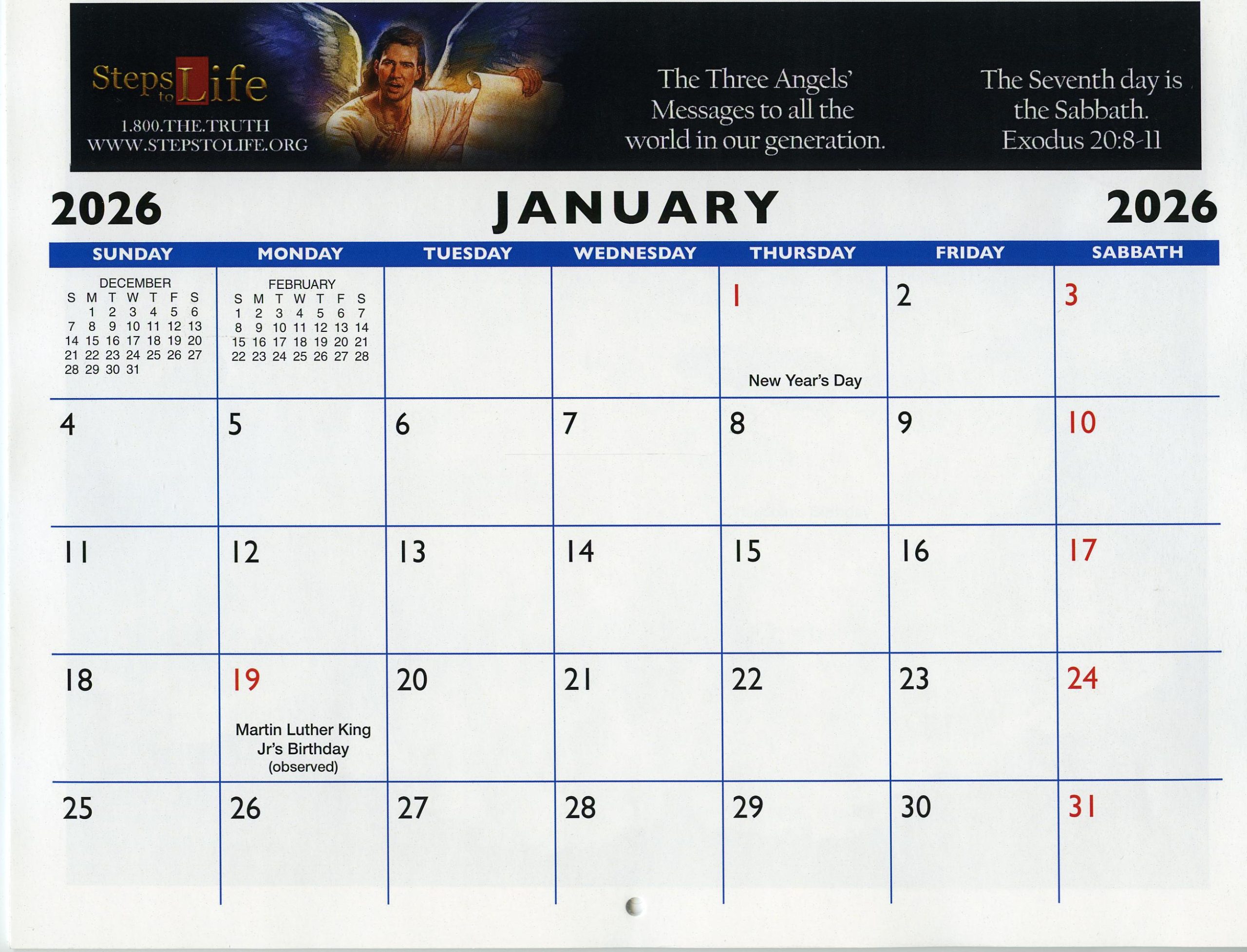 A beautiful full-color 2026 calendar with Scripture quotes and the seventh-day Sabbath highlighted. 14″ tall when hanging.